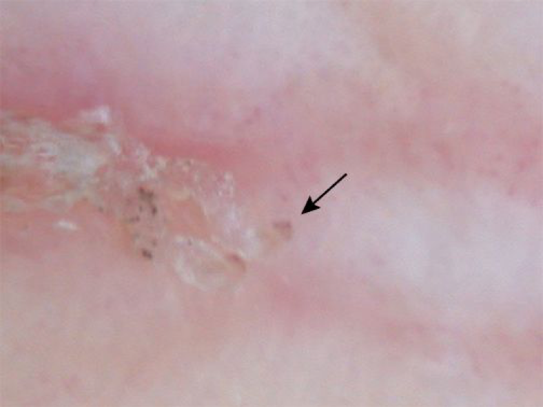 Dermoscopy can be used to see the mite in burrow and is classically referred to as the “delta wing” sign, which is the dark head of the mite at the end of a burrow.