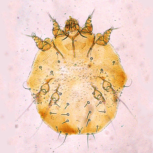 Scabies is caused by the mite Sarcoptes scabiei, which is a whitish-brown, eight-legged mite and it just barely visible by the naked eye at its largest size of 0.4×0.3mm. Only the female mite causes the dermatologic manifestations seen in scabies, as it burrows into the epidermis down to the stratum granulosum layer to lay her eggs.