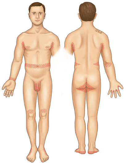 Head, face, and back are not commonly seen and this is theorized to be due to the increased oil production in these areas.