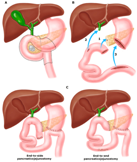 History – The first resection of a periampullary cancer was performed by German surgeon Walther Kausch (1867-1928) in 1909, took four hours to complete, and the patient survived for 9 months. American surgeon Allen Oldfather Whipple (1881-1963) began working on and refining the procedure in 1935 and in 1940, successfully shortened it to a one-stage procedure.