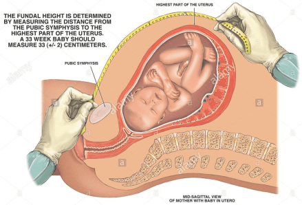 Measuring fundal height is a skill PA students must acquire on their OBGYN rotation.  Using a rolled tape measure, the distance is measured (in cm) from the pubic symphasis to the highest part of the uterus.  Note that it may not be mid-line and you will need to do some palpation to find the apex.
