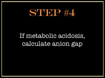 - First step after determining that a patient has a metabolic acidosis is to calculate the anion gap