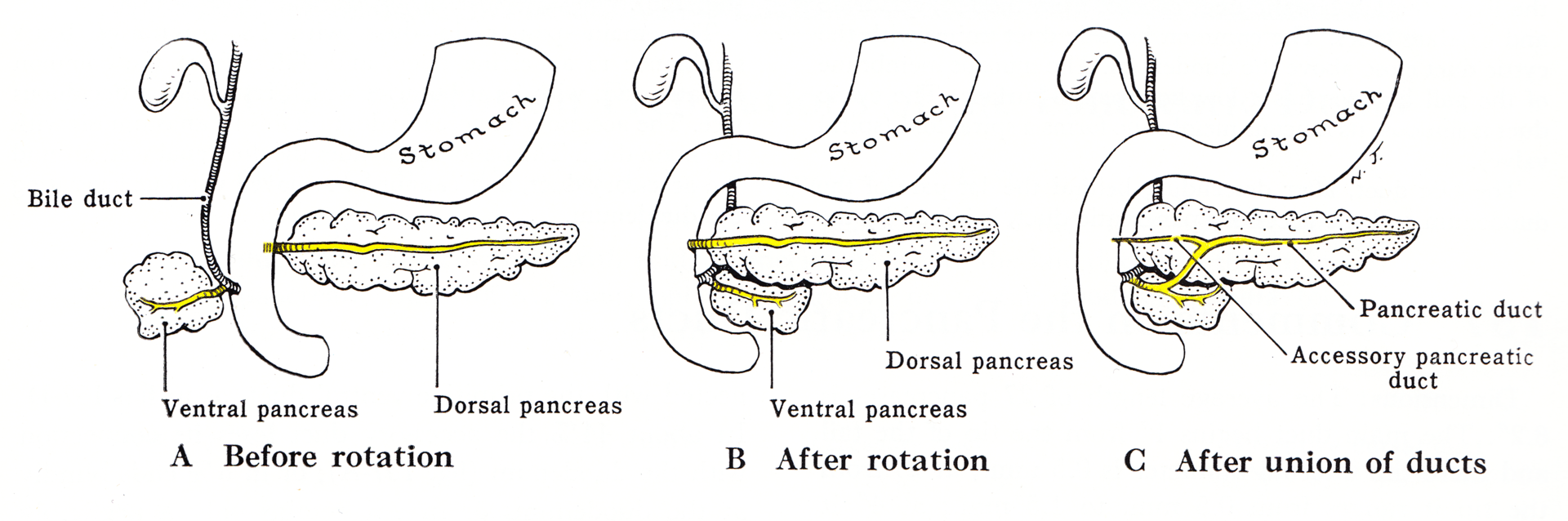 Clinical Significance – 85% of the population have a single, main pancreatic duct and 15% can have an accessory duct that either drains into the duodenum by a separate ampulla (2/3), or drains into the main duct (1/3). These anatomical variants need to be explored prior to instrumentation for pancreatic pathology as it can occur with pancreas divisum, which makes the accessory duct the principle drainage duct for the pancreas.