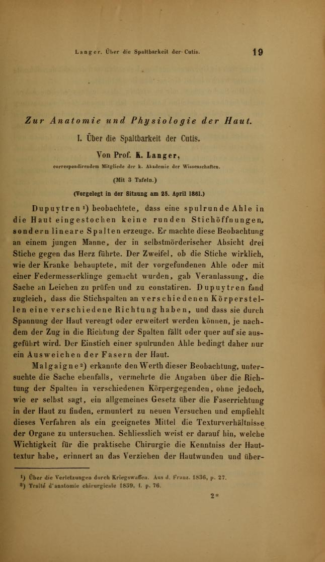 - Langer K. “Zur Anatomie und Physiologie der Haut. Über die Spaltbarkeit der Cutis”. Sitzungsbericht der Mathematisch-naturwissenschaftlichen Classe der Wiener Kaiserlichen Academie der Wissenschaften Abt. 44 (1861)