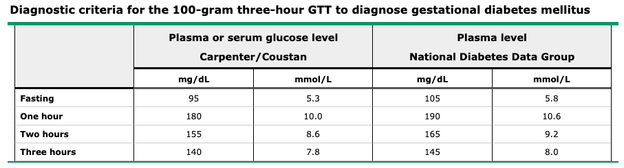 - 100g, three-hour oral glucose tolerance test