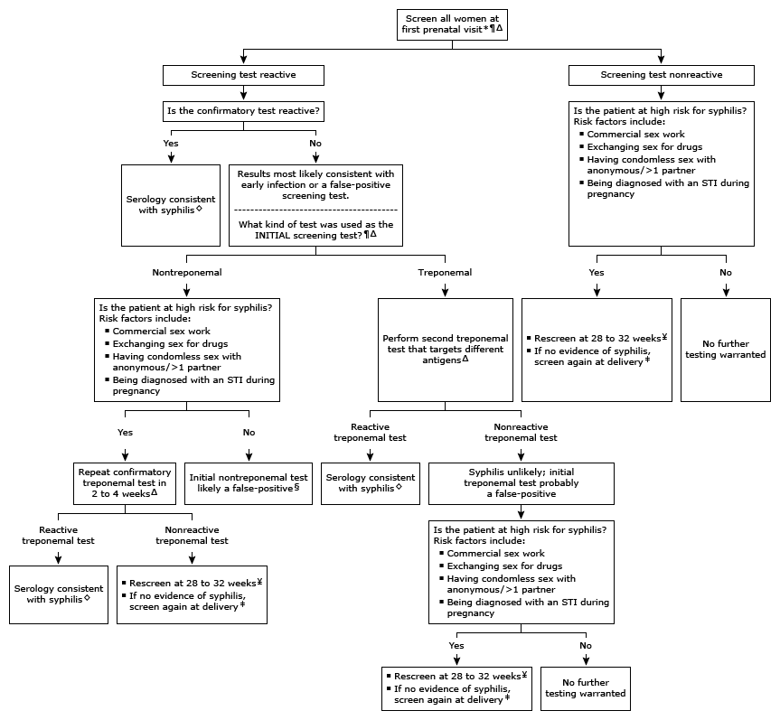 - Can screen with either a non-treponemal or treponemal test, but a (+) screening test is confirmed with a treponemal test