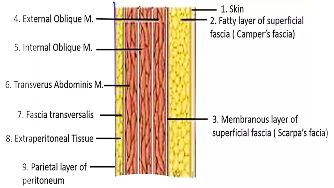 There are nine layers to the anterior abdominal wall and they are (from superficial to deep):