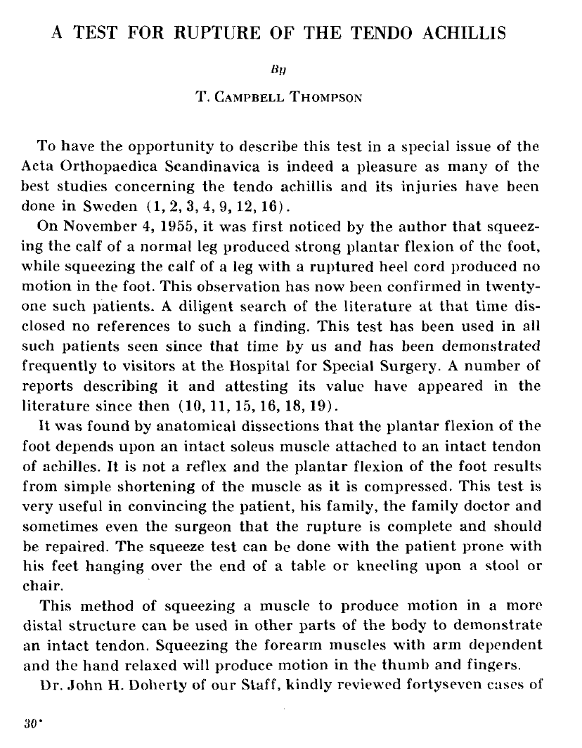 History – Named after Theodore Thompson (1902-1986), an American orthopaedic surgeon who received his medical doctorate from Johns Hopkins University in 1928. Prior to enrolling at Hopkins, he was involved in a traumatic arm injury working at a steel mill where his arm went through a planer. Luckily, a local orthopaedic surgeon, knowing Thompson want to go into medicine, did not amputate and reconstructed his arm to regain full function. His career achievements include heading the amputation center at Walter Reed Hospital during World War II and becoming president of the American Academy of Orthopaedic Surgeons in 1954. He described his eponymous finding in 1962 in two separate articles….which was AFTER Franklin Adin Simmonds (1910-1983), a British orthopaedic surgeon, published the same findings in 1957. Thompson did however acknowledge and reference Simmonds in his 1962 paper. Depending on what side of the pond you trained on will determine how you learned the name of this test.