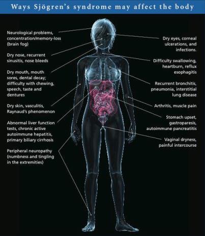 Clinical Significance – Patients affected by this disease have dry eyes, dry mouth, dry skin, and various other systemic abnormalities. The exact mechanism is unknown, but is believed to be a combination of genetics (HLA association) and environmental triggers (viral pathogens).