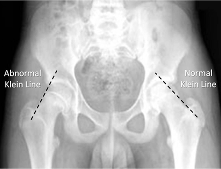 2. Diagnosing SCFE on plain radiographs is accomplished by drawing a parallel line from the lateral femoral neck towards the femoral head. This line is called Klein’s Line. In normal patients, this line should intersect the lateral portion of the femoral head. In SCFE patient, it does not.