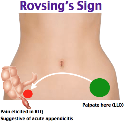 Clinical Significance A positive Rovsing’s sign is suggestive of appendicitis. There are two mechanisms that illicit this response. First, palpation of the left lower quadrant stretch the peritoneal lining over the appendix and causes pain. Second, deep palpation of descending colon in the left lower quadrant causes the gas present to stretch the lumen of the colon and appendix causing pain.