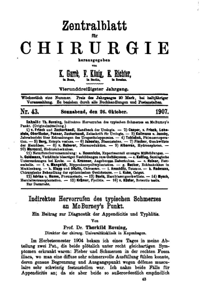 6. N. T. Rovsing. Indirektes Hervorrufen des typischen Schmerzes an McBurney’s Punkt. Ein Beitrag zur diagnostik der Appendicitis und Typhlitis. Zentralblatt für Chirurgie, Leipzig, 1907, 34: 1257-1259.