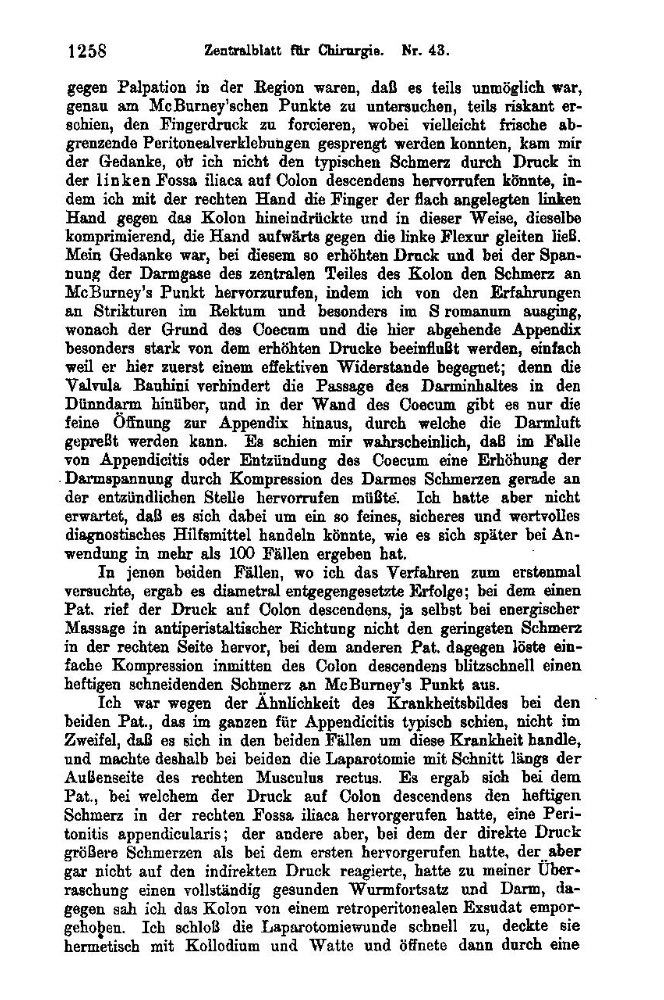 A symptom exists which is of great importance and which I always found to hold true if it was evident to the hand, namely muscle tension across the cecal region and adjacent portion of the abdomen when touch or light pressure was applied, the significance of which was first pointed out by Dieulafoy (défense musculaire). If this symptom is found, you can be almost certain there is already a high level of change in and around the appendix – gangrene or perforation with developing permanent peritonitis, free or limited. Furthermore, I have always found another symptom evident, namely a pain located to the ileoecal tract with pressure to the left part of the abdomen.