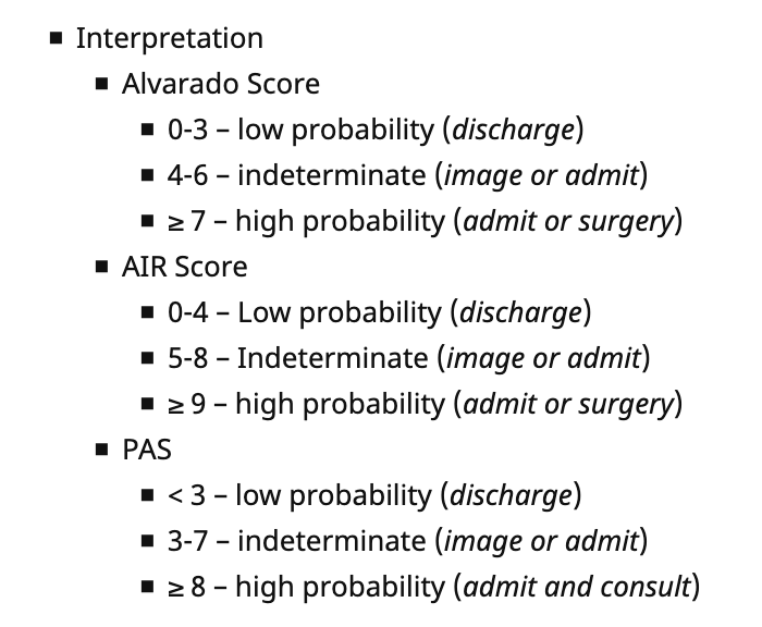 What are some of the validated scoring systems for patients with suspected appendicitis and how do you use them in clinical decision making?
