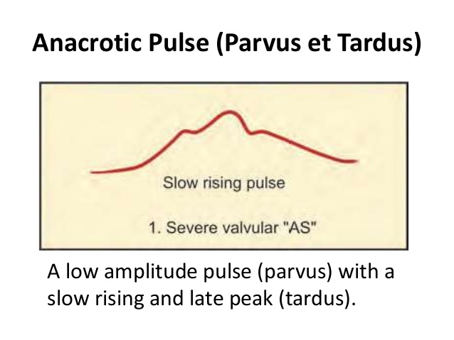 PV – carotid pulse is weak and has a slow rise, murmur is appreciated