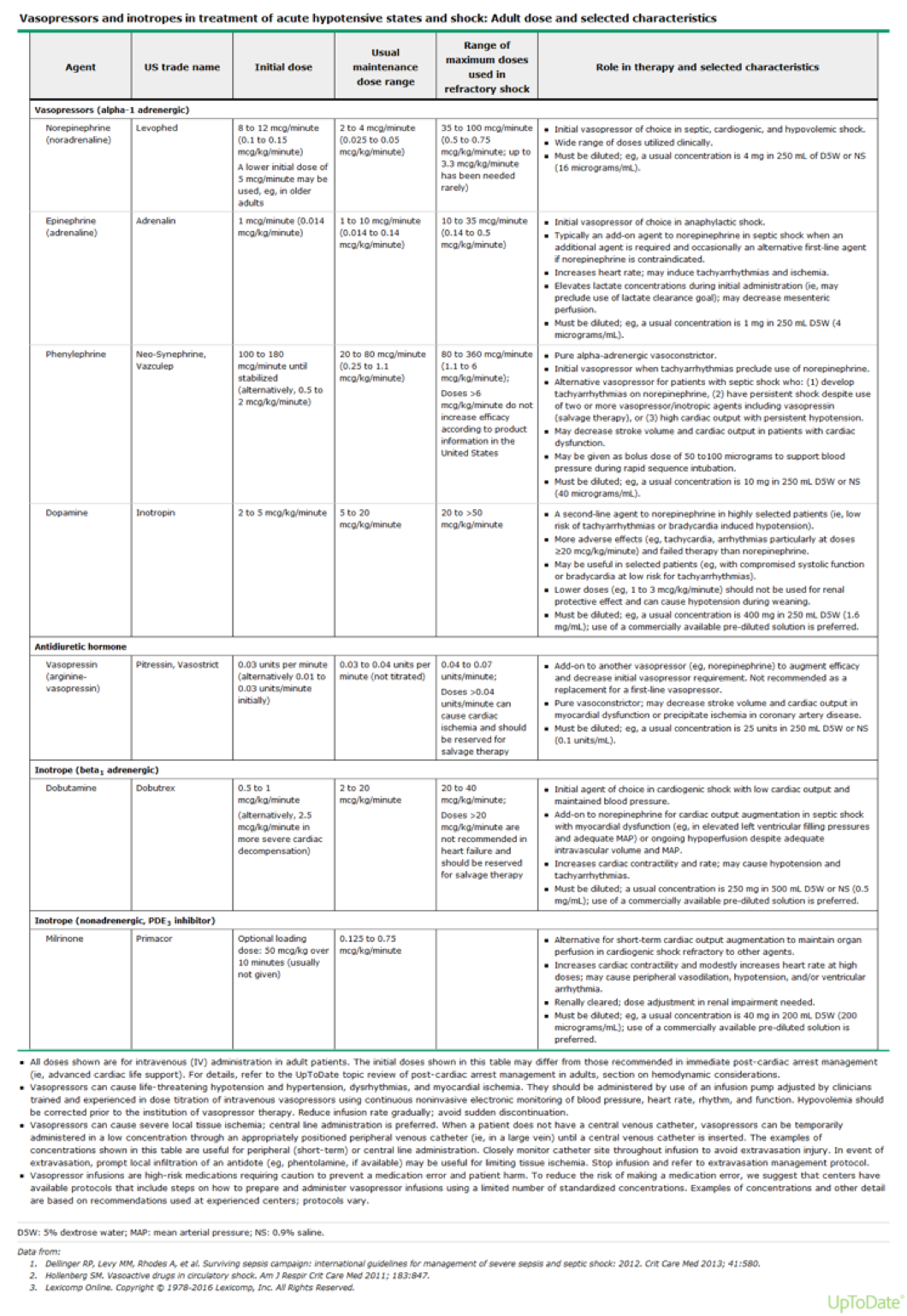 - Gaieski DF, Mikkelsen ME. Evaluation of and initial approach to the adult patient with undifferentiated hypotension and shock. In: UpToDate, Parsons PE (ed), Waltham, MA. Accessed on 08/17/16. http://www.uptodate.com/contents/evaluation-of-and-initial-approach-to-the-adult-patient-with-undifferentiated-hypotension-and-shock?source=see_link#H87905481