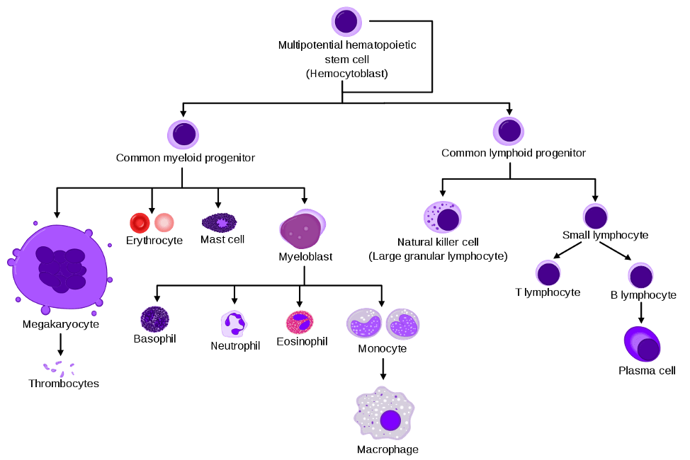 - Multipotential hematopoietic stem cell –> common myeloid progenitor –> myeloblast