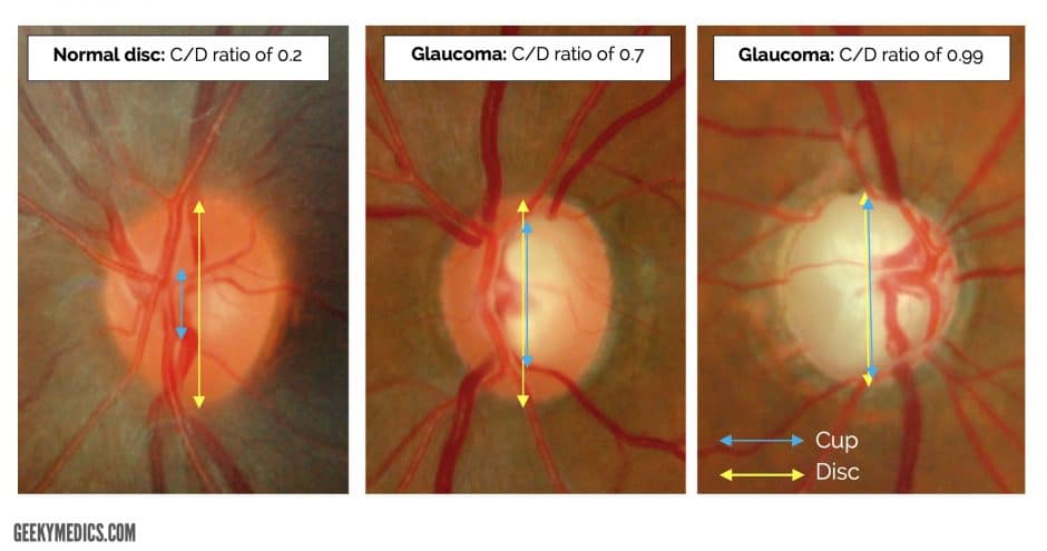 - The old and busted bedside way to determine if a patient has increased intracranial pressure is the fundoscopic examination. What you are looking for specifically is the cup:disc ratio of the optic nerve. Normal is around 0.3, or 1/3rd. If it is increased, it suggests increased intracranial pressure.