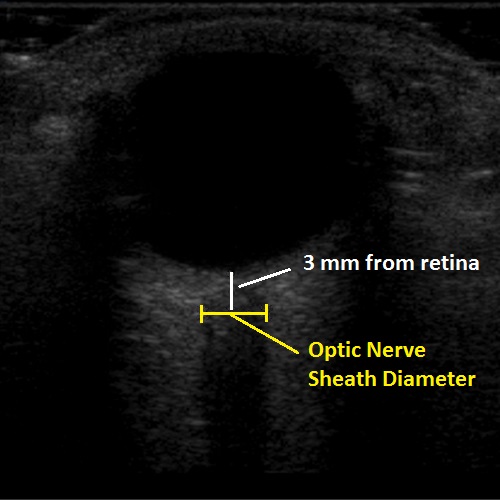 2. The new, hotness is using bedside POCUS to measure the optic nerve directly. Using the high frequency linear probe with a tegaderm placed over the patient eye, place a generous amount of gel over the globe and measure the optic nerve 3mm from the retina. A normal optic nerve should be < 5mm in diameter and anything over than suggests increased intracranial pressure