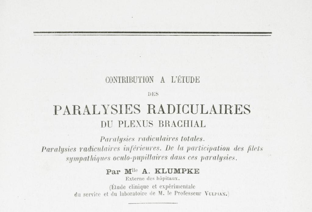 - Déjerine-Klumpke, A. Contribution à l’étude des paralysies radiculaires du plexus brachial. Paralysies radiculaires totales. Paralysies radiculaires inférieures. De la participation des filets sympathiques oculo-pupillaires dans ces paralysies. Revue de médecine 1885, 5: 591-616, 739-90.
