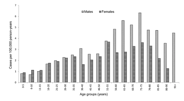 - Slightly higher incidence in men than women