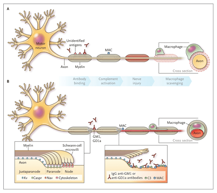 - Attack is directed at the nodes of Ranvier of the ventral roots of the peripheral nerves