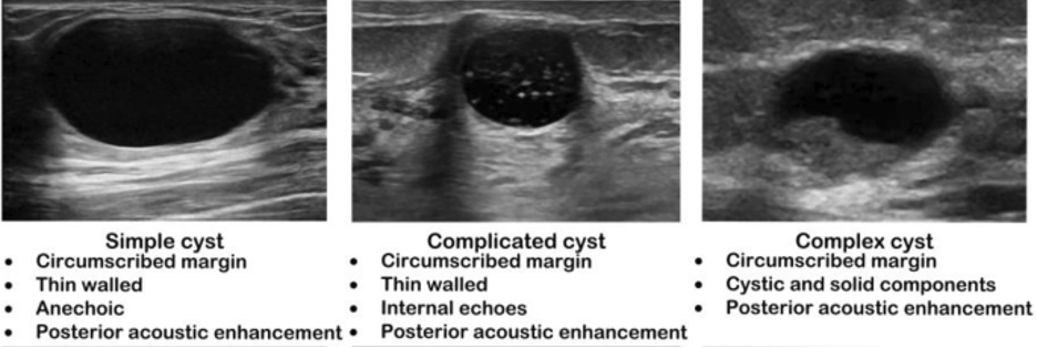 - Homogenous low-level internal echoes with debris, thick walls, or thick septa