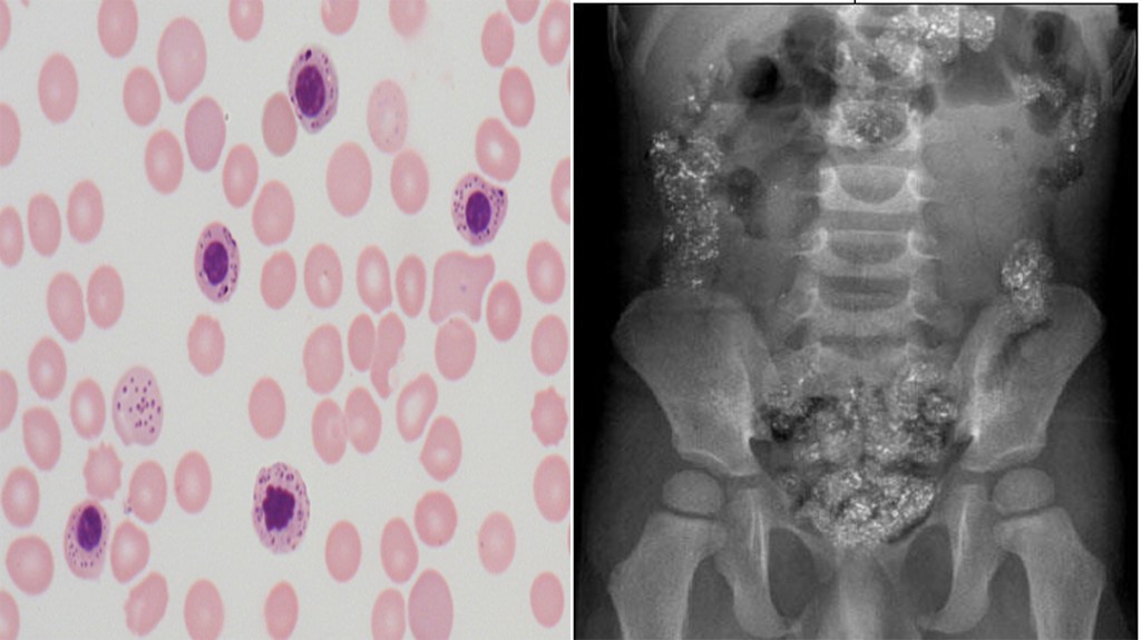 - The peripheral smear reveals stippling and granules in the basophils and the abdominal radiograph shows hyperlucent flecks throughout the colon. These findings with the history of living in a older home leads to the most likely diagnosis of lead intoxication from eating the chipped paint.