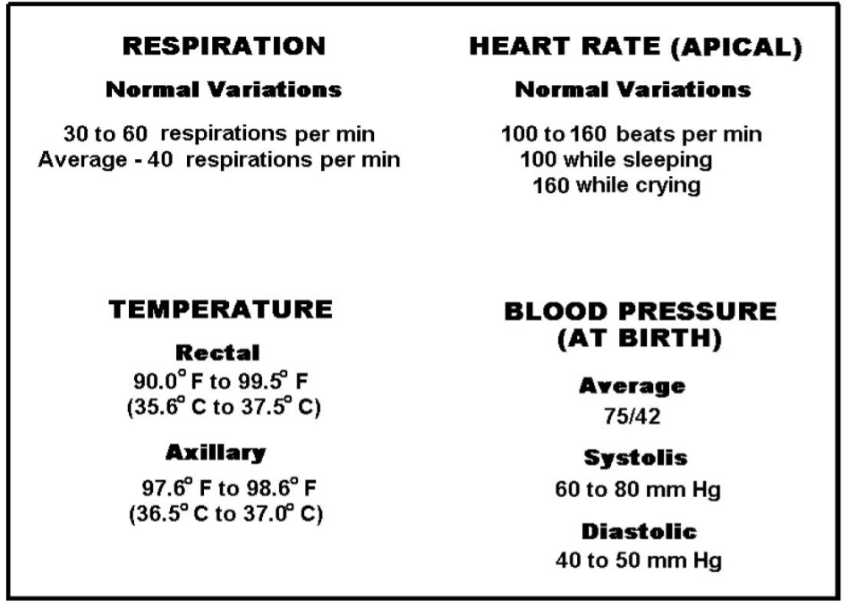 - Should be documented every 30-60 minutes for first 6 hours of life, then every 8-12 hours