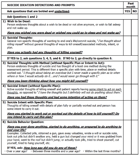 - Series of six questions asking about suicidal thoughts and actions over the past month