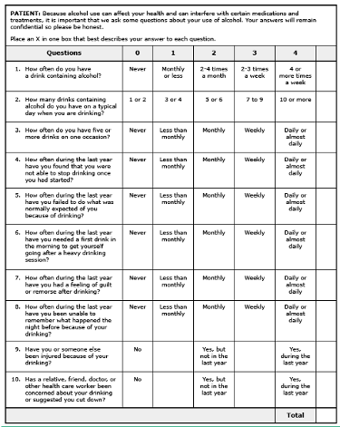 - Bush K, Kivlahan DR, Mcdonell MB, Fihn SD, Bradley KA. The AUDIT alcohol consumption questions (AUDIT-C): an effective brief screening test for problem drinking. Ambulatory Care Quality Improvement Project (ACQUIP). Alcohol Use Disorders Identification Test. Arch Intern Med. 1998;158(16):1789-95. [pubmed]